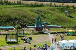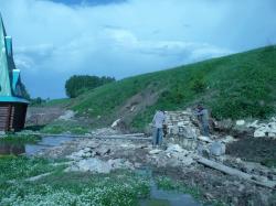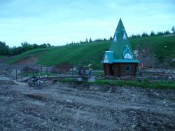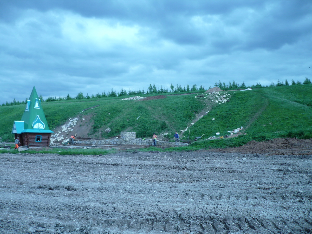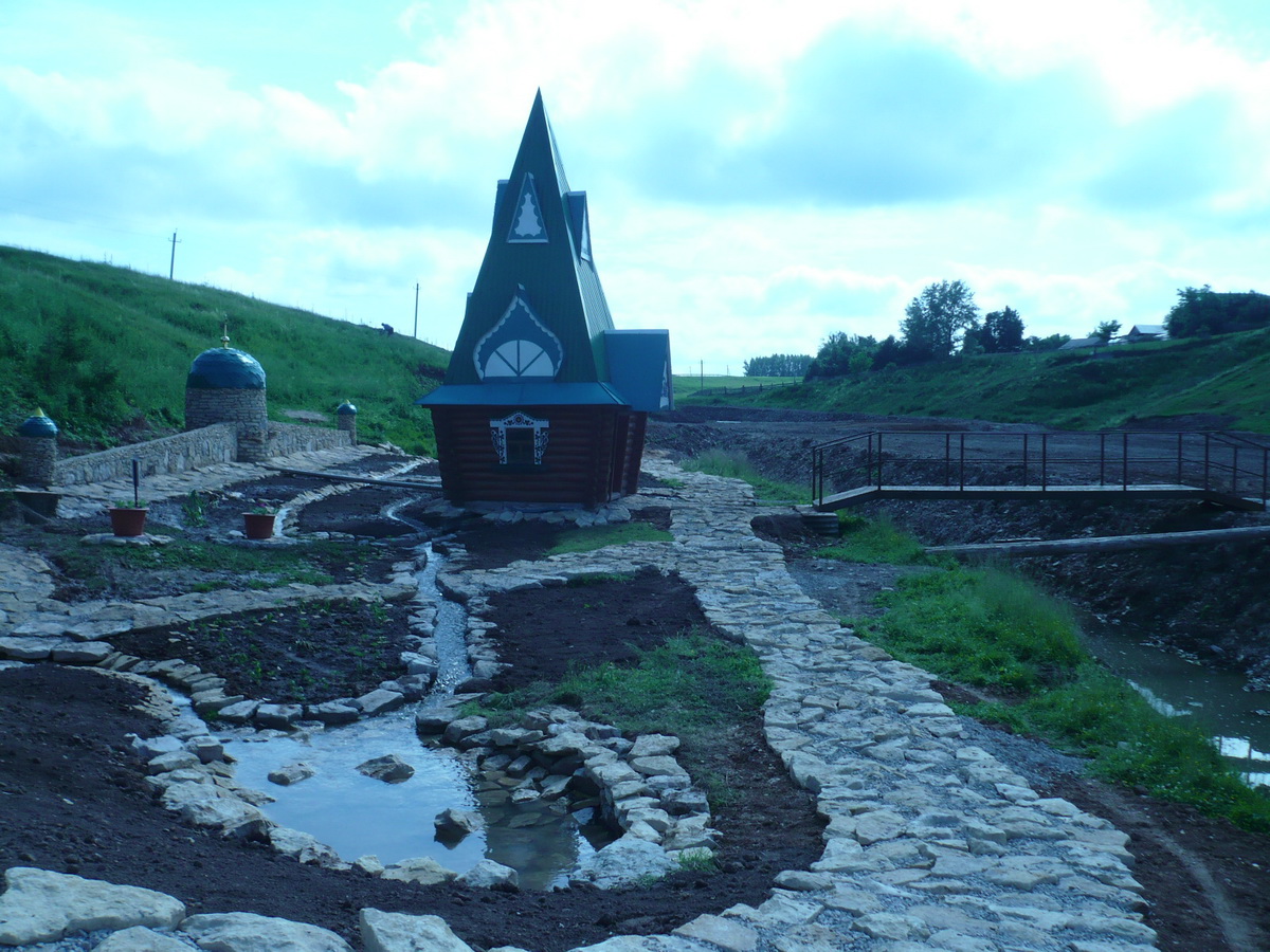 Территория красиво благоустроена построен деревянный павильон, малые архитектурные формы выложены из камня, дорожки замощены им же, через ручей перекинут мостик.