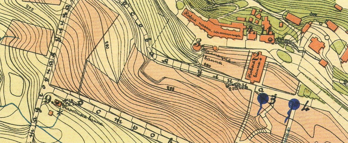 Фрагмент плана Железных вод 1887 г. Экспликация. VI — галерея источника № 8; Ф — грот Михайловского источника; X— Завадовский источник; Ш — Барятинские ванны; Щ — Ново-Барятинские ванны