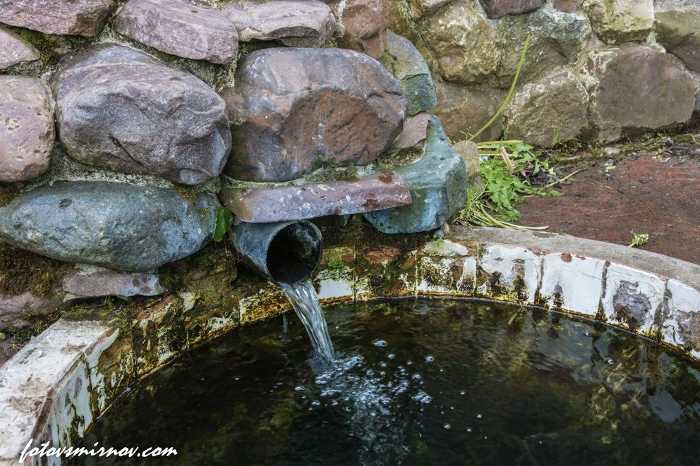 Над родником построена красивая деревянная часовня, родниковые воды вытекают за стенами часовни.