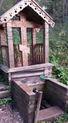 Источник очень красиво оформлен в духе деревянного зодчества Русского Севера. Над каптажной камерой поставлен большой поклонный резной крест, крытый небольшой сенью. Рядом поставлен другой крест, выполненный из металла.