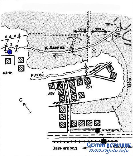 родник. От поселка через 800 м будет тропа влево, в низине реки, вдоль неё, через 350 м тропа приближается к дачному поселку, на другом берегу. К нему ведет сырая тропа, идущая по мостику через речку. Не сворачивая, идем тропинкой вдоль берега реки еще около 100 м до поворота к следующему мостику (сыро!). Рядом с ним находится родник.
