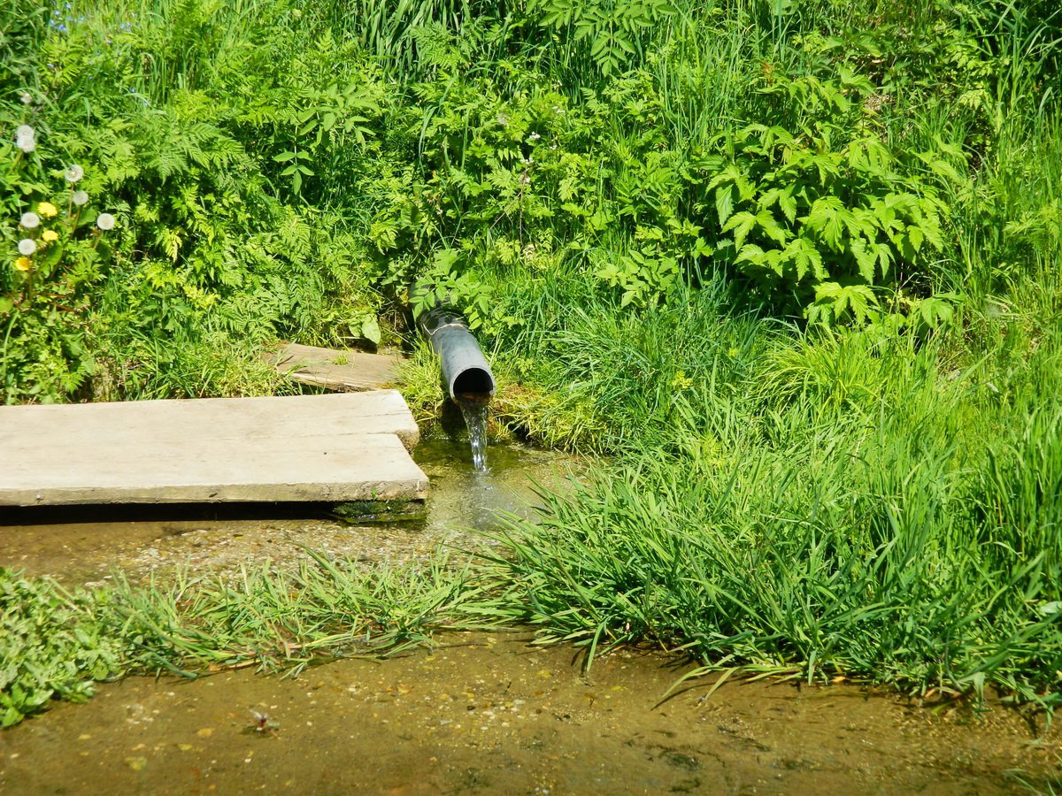 Родник каптирован, слив родниковой воды по трубе.