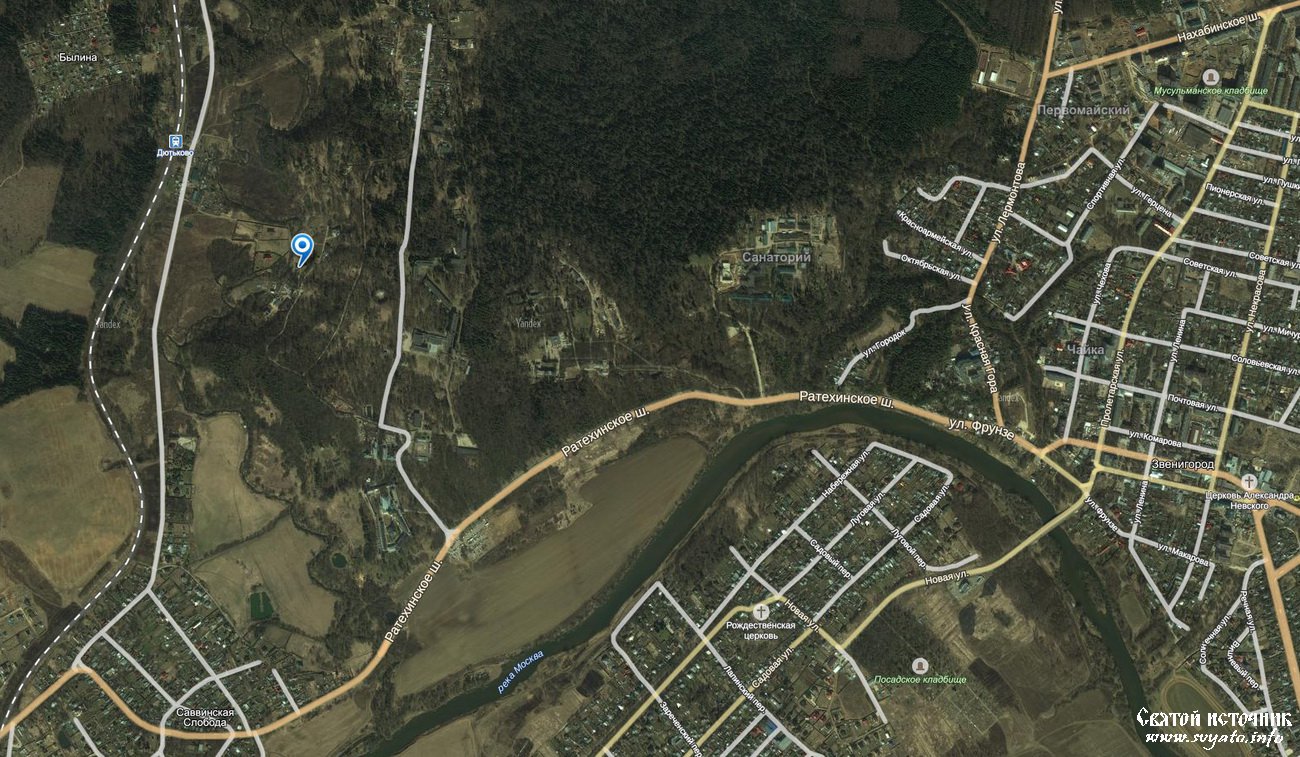 Как добраться: на общественном транспорте скит находится западнее города, на правом берегу реки Разварня, в 8 км от станции Звенигород на Белорусском ж/д направлении, откуда до монастыря можно добраться автобусами № 23, № 51 до остановки «Дом отдыха Минобороны», затем пешком. От остановки идем или едем вверх по асфальтированной дороге оставляя монастырь слева. Далее по узкой асфальтированной дороге вдоль ограждения военного санатория «Звенигородский», далее левее петляющей дорогой в смешанном лесу к Саввино-Сторожевскому скиту, внизу слева глубокий овраг, по которому течет река. Через 200 м развилка, влево указатель «Скит» (на дороге шлагбаум). Через 100 м дорога уходит вниз и вправо, огибает небольшой холм и спускается к расширяющейся долине реки, где слева уже видны первые строения скита. До старого братского корпуса от развилки 600 м. Здание выстроено рядом с храмом преподобного Саввы. Когда-то на месте церкви старцем была ископана пещерка, где он и совершил уединенный подвиг. К родникам спускаемся от братского корпуса по кирпичным ступенькам с поручнем.