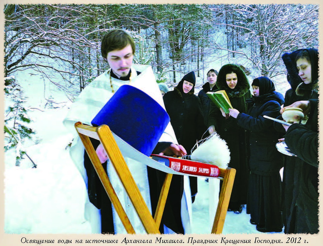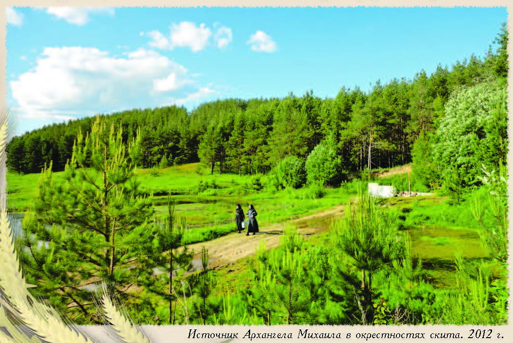 Источник появился совсем недавно. Сёстры иногда уходили молиться в соседний лесочек. При этом заметили, что ничем не примечательная луговина на опушке соснового леса притягивала не только красотой природы, но здесь молиться было особенно хорошо. Однажды сёстры обнаружили, что среди кочек в земле сочится вода. Со временем вода стала прибывать, и заискрился поток чистой воды. Так буквально на глазах сестёр в наше время близ Архангельского скита образовался источник. По благословению игумении Сергии его освятили в честь Архангела Михаила и обустроили. На роднике построена деревянная купальня. Рядом с источником находится пруд. Люди идут и идут в это место. Координаты: 55°14'31.4"N 43°41'24.4"E Фото сайта Архангельского Скита В.О. Федин. Святые источники Дивеевской земли. Путеводитель. История Чудеса исцеления. Рязанская областная типография. 2016 г.
