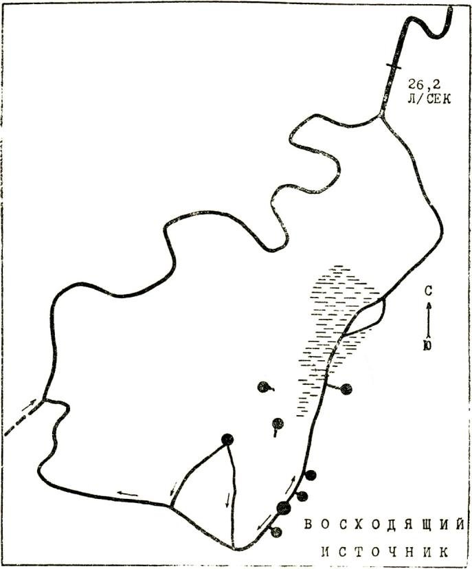 Источники 23–30 питают ручей, впадающий в рукав р. Иргины. В 6 м выше его устья была отобрана проба воды. Анализ показал, что минерализация ручья составляет 462 мг/л, а состав гидрокарбонатно-кальциево-магниевый. Расход ручья выше устья равен – 11,3 л/сек, а суммарный дебит питающих его родников – 16,4 л/сек, т. е. несколько больше расхода ручья. Это объясняется, возможно, неточностью замеров, а также частичной фильтрацией воды в рыхлые отложения.