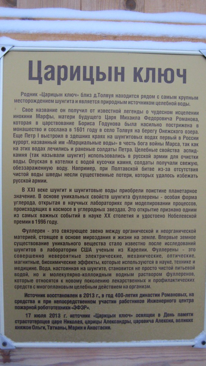 Автор: Алексей Дата: 2 июля 2019 г. Издавна приписывают целебные свойства родниковым водам «Царицына ключа». Породы, в которых формируются подземные воды с минерализацией 0,4 г/л, отличаются высоким содержанием шунгитового вещества (до 30%). Источник находится рядом с самым крупным месторождением шунгита около села Толвуя.