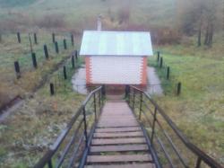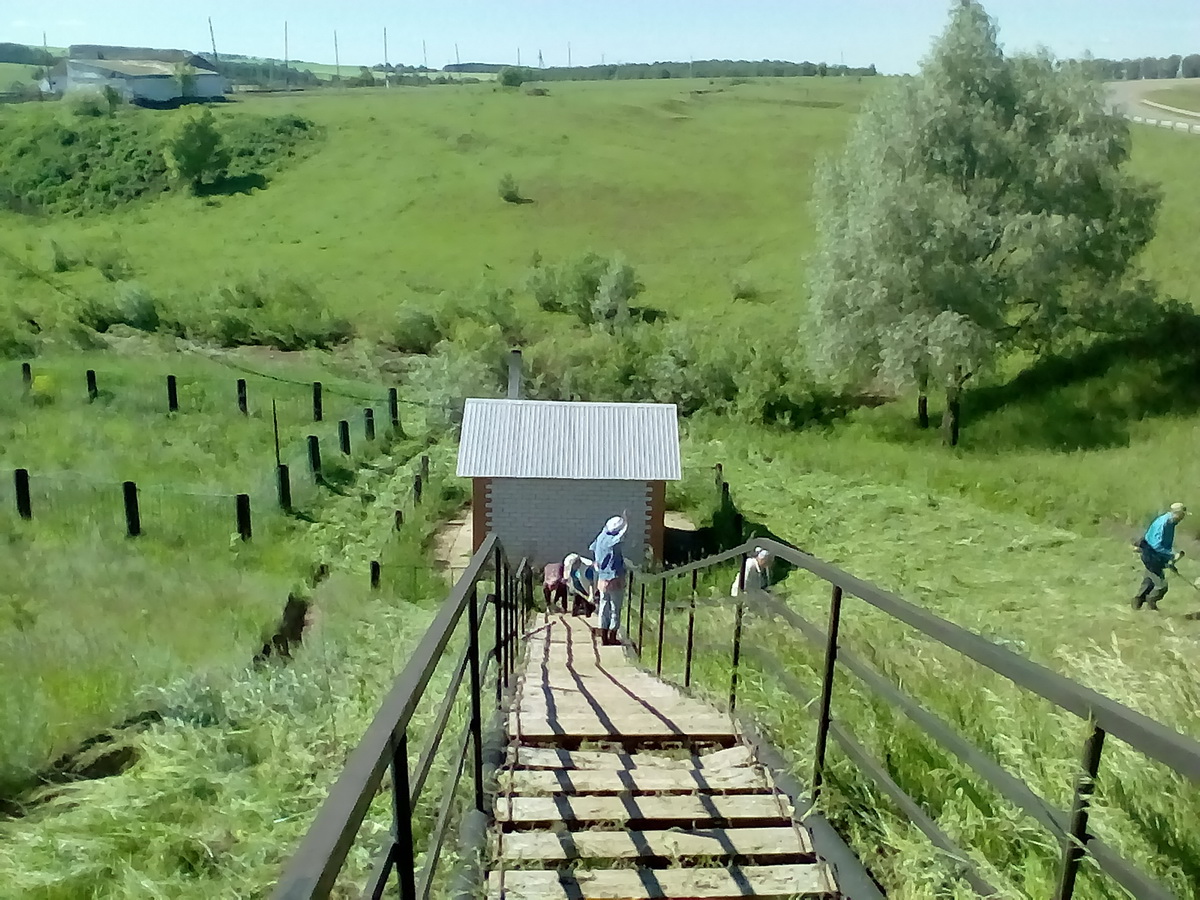 Наверху установлена беседка для отдыха, устроена стоянка для транспорта, от которой к роднику спускается лестница, в середине склона построен кирпичный домик над каптажом, место для набора воды организовано ниже.