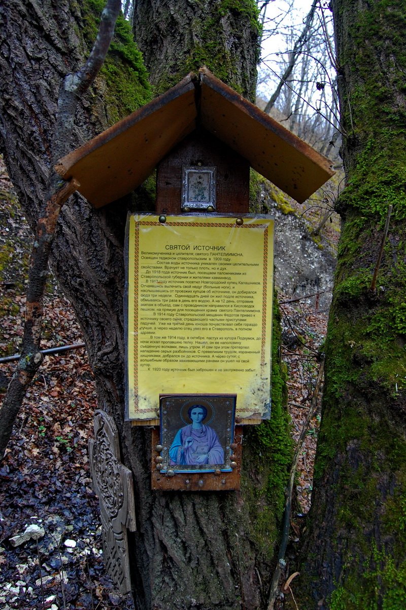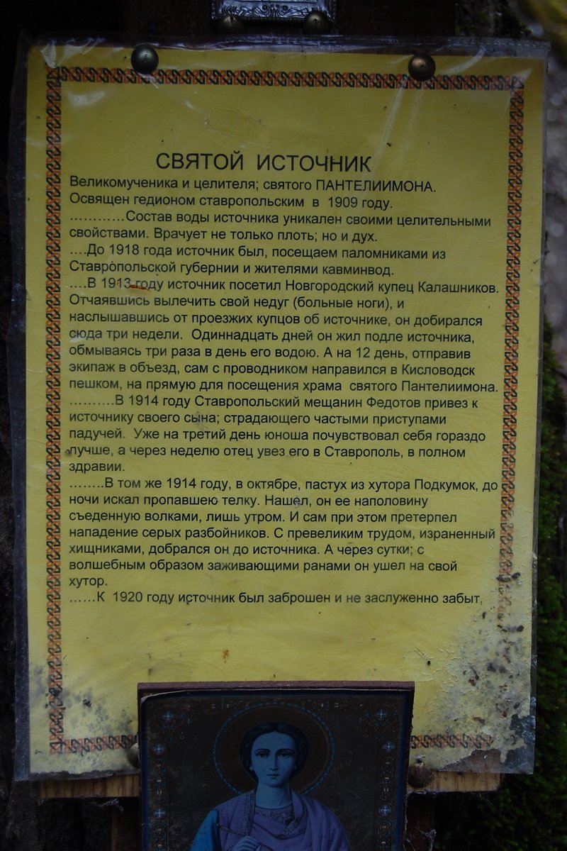 ... В 1913 году источник посетил Новгородский купец Калашников. Отчаявшись вылечить свой недуг (больные ноги), и наслышавшись от проезжих купцов об источнике, он добирался сюда три недели. Одиннадцать дней он жил подле источника, обмываясь три раза в день его водою. А на 12 день, отравив экипаж в объезд, сам с проводником направился в Кисловодск пешком, на прямую для посещения храма свитого Пантелеимона.